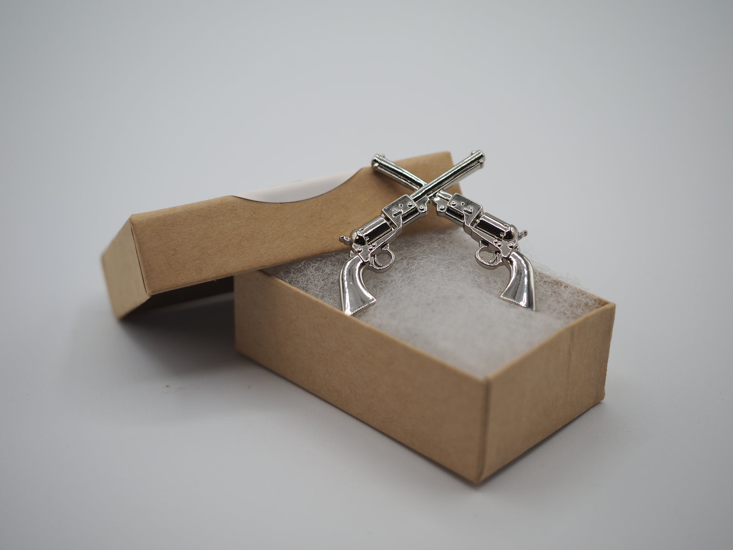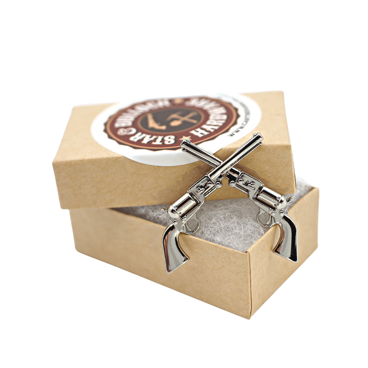 This is a very attractive pin of two crossed 1851 Navy black powder revolvers. The screw backs are 1 inch apart and fully screwed in sit 1/8" off of the back face. This is the Silver color. screws included.