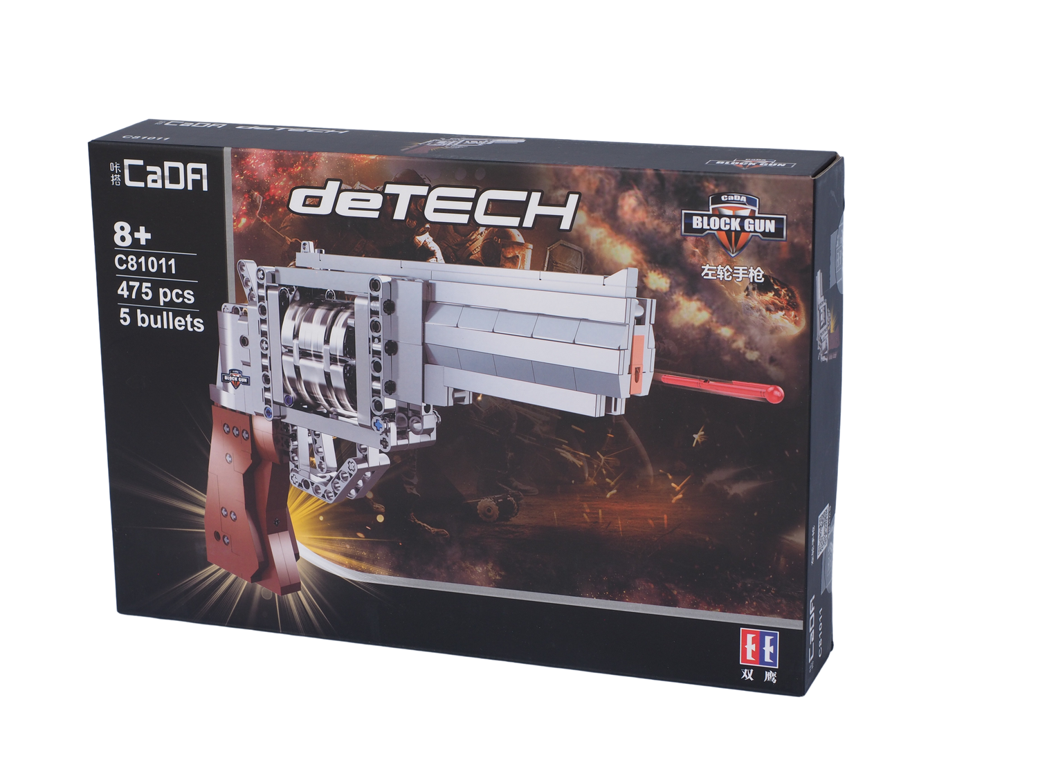 Build the classic Dirty Harry revolver of out plastic blocks. This model is 475 pieces and comes with five plastic darts. The "Block Gun" logo on the gun is a sticker and most people will not use it. This is a very different gift for the firearms fan in your life. Includes branded color box. These models are in hand and will ship within two days of your order from the east coast USA.